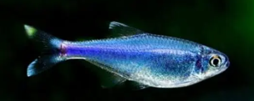 Türün en dikkat çekici özelliği, tatlı su balıkları arasında nadir bulunan gerçek mavi renklenmesidir. Vücudun büyük bölümü yarı şeffaf olup, arka yarısı — özellikle sırt hattından kuyruk sapına uzanan bölge — metalik çelik mavisi bir parıltıyla kaplanır. Kuyruk kökünde hafif pembe/gül rengi tonlar görülür; bu “kızaran” görünüm, türün iridesent cazibesini artırır. Vücut ortasından geniş, koyu siyah bir longitudinal çizgi uzanır. Yüzgeçler büyük ölçüde şeffaftır. Dorsal ve kuyruk yüzgeçleri arasında küçük bir adipöz yüzgeç bulunur.